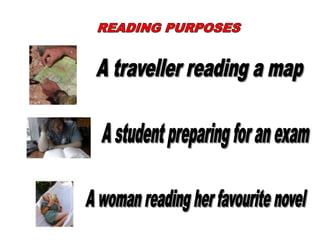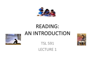This document defines reading as a complex mental process where the reader uses strategies to understand the meaning intended by the author based on text and prior knowledge. It identifies reading as a rapid, comprehending, interactive, strategic, flexible, purposeful, evaluative, and learning process that uses linguistic knowledge. There are three main reasons for reading: survival, learning, and pleasure. Effective reading involves a flexible response guided by the reader's purpose. Fluent readers notice features, read for meaning, predict, apply background knowledge, use repetition, and switch between text and knowledge. Implications are that L2 reading instruction should consider varied student goals, tasks, texts and objectives.