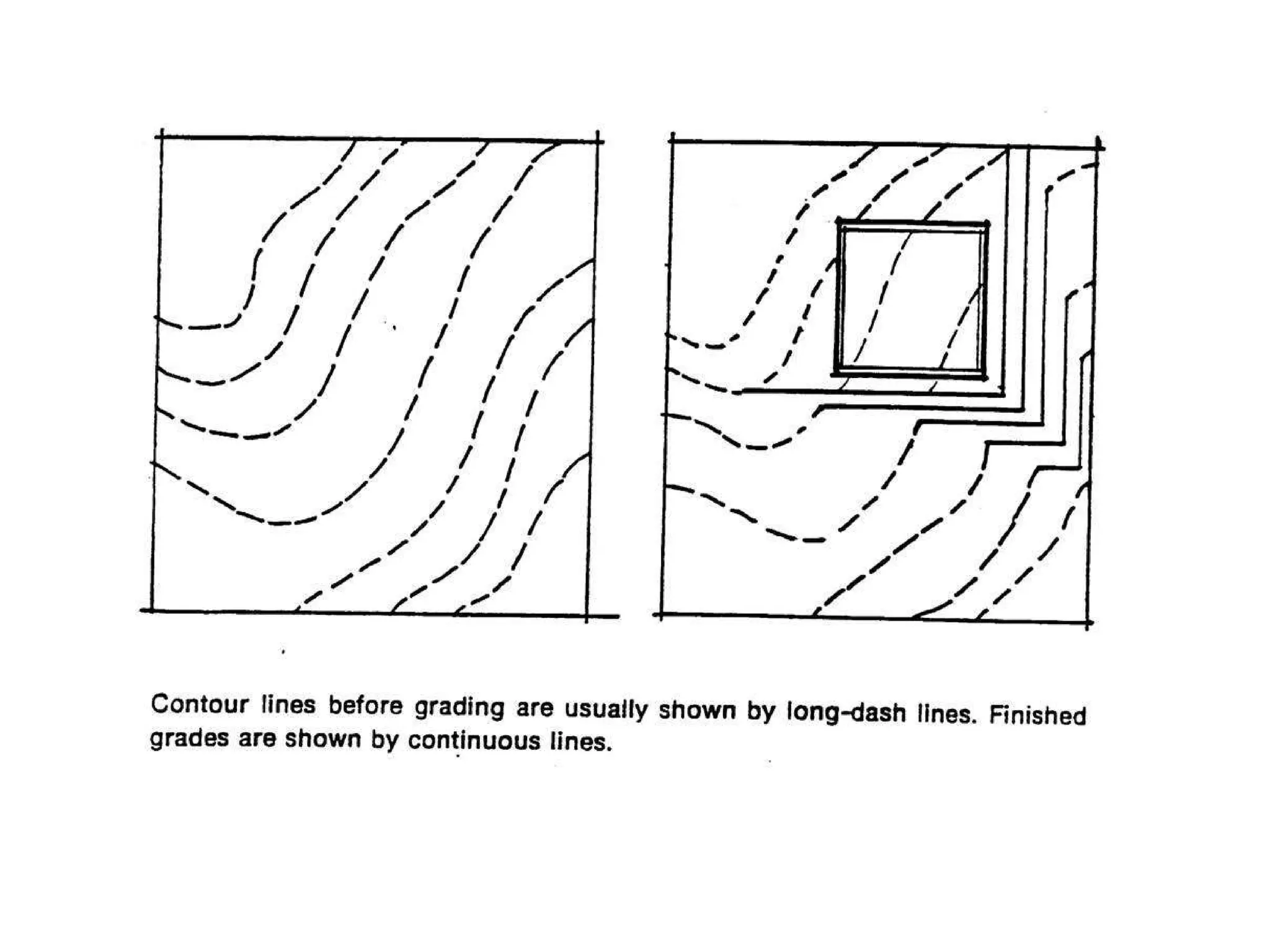 Various ground shapesas represented by contour lines and site sections contour lines spaced far apart indicate a flat surface contour lines spaced evenly describe a constant slope contour lines spaced close together designate a steep rise/fall in elevation