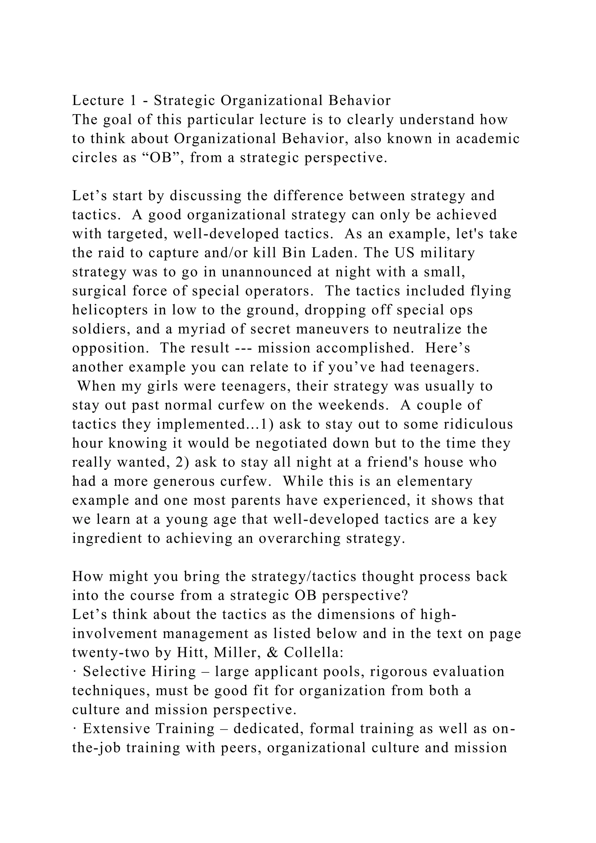The lecture on strategic organizational behavior emphasizes the importance of aligning strategy with well-defined tactics, illustrated through examples such as the U.S. military raid to capture bin Laden and teenage negotiation tactics. It discusses high-involvement management dimensions like selective hiring, extensive training, and information sharing, using Google as an exemplary model of successful implementation. The lecture also introduces a final project focused on diagnosing and improving an organization's processes or structures, encouraging students to apply organizational behavior concepts to real-world scenarios.