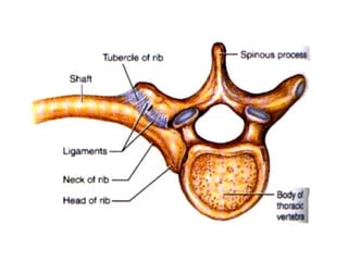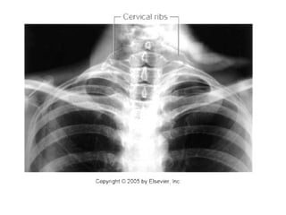 The document outlines the anatomy of the thoracic wall, including the axial and appendicular skeleton components such as the sternum, ribs, and thoracic vertebrae. It describes rib anatomy, types of ribs (true, false, and floating), and articulations with the vertebrae and sternum, as well as the clinical significance of structures such as the sternum for marrow biopsies. Additionally, it discusses thoracic openings, potential thoracic outlet syndrome, and the implications of anatomical variations like cervical ribs.
