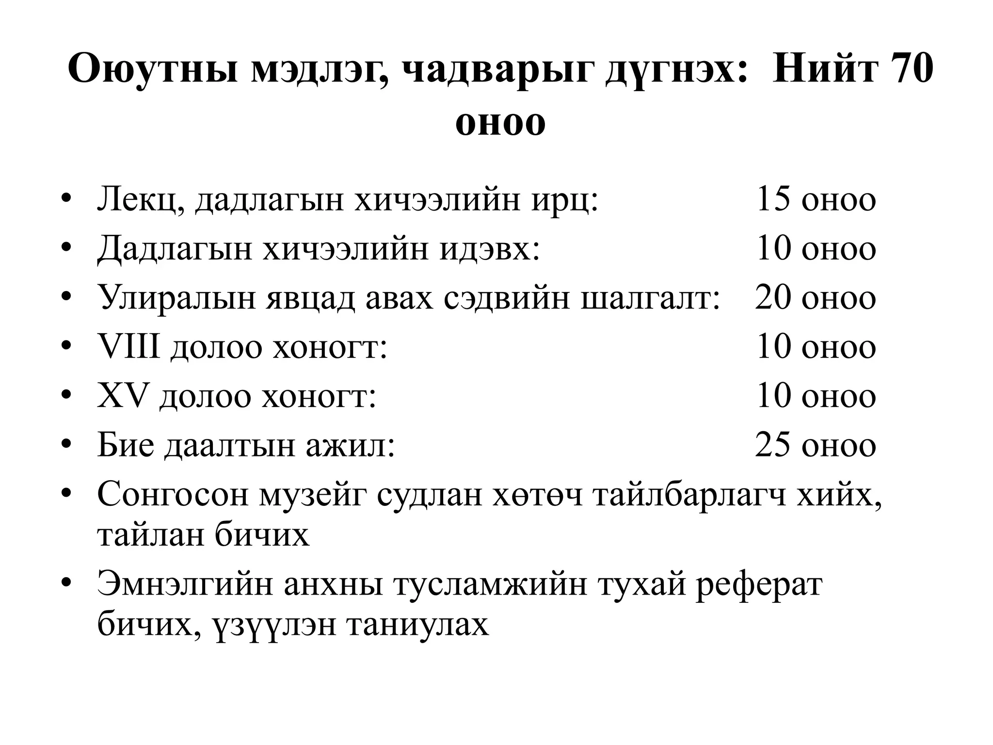 Оюутны мэдлэг, чадварыгдүгнэх: Нийт 70