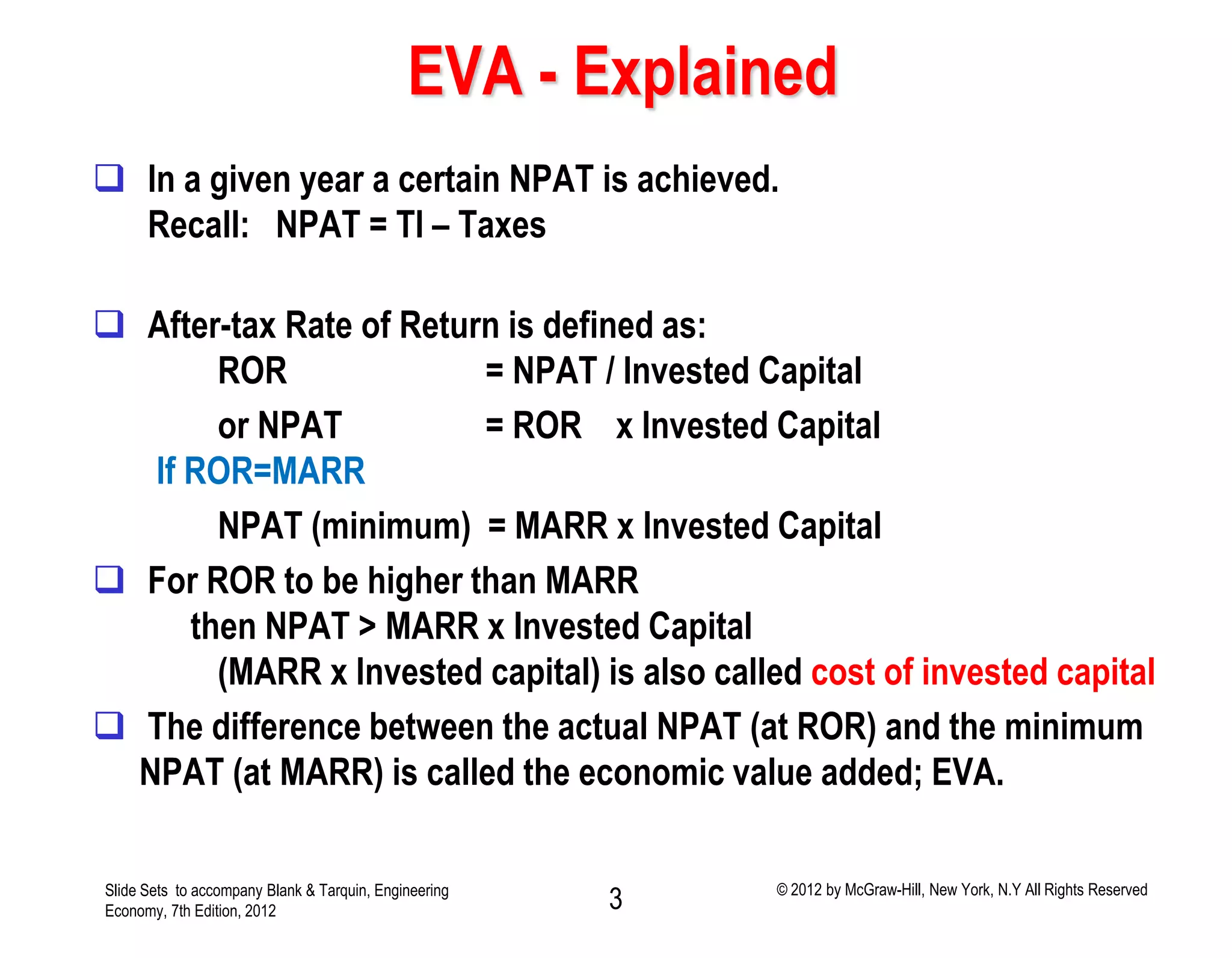 3) The document provides an example calculation of EVA and cash flow analysis for a project over 4 years to demonstrate how the analyses are economically equivalent. Both show the project is not justified at the 12% after-tax hurdle rate.