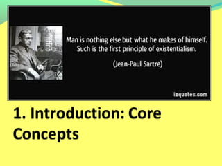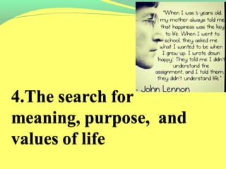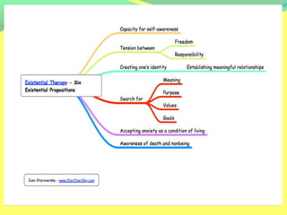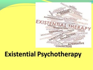 Existential psychotherapy focuses on fundamental human experiences like death, freedom, relationships and finding meaning. It views people as responsible for making their own choices and finding their identity. Key influences include Viktor Frankl's logotherapy, Rollo May who applied existential philosophy to therapy, and Irvin Yalom who emphasized concerns with death, freedom, isolation and meaninglessness. Existential therapy aims to help clients through increased self-awareness and by addressing anxiety from confronting human realities rather than eliminating it.