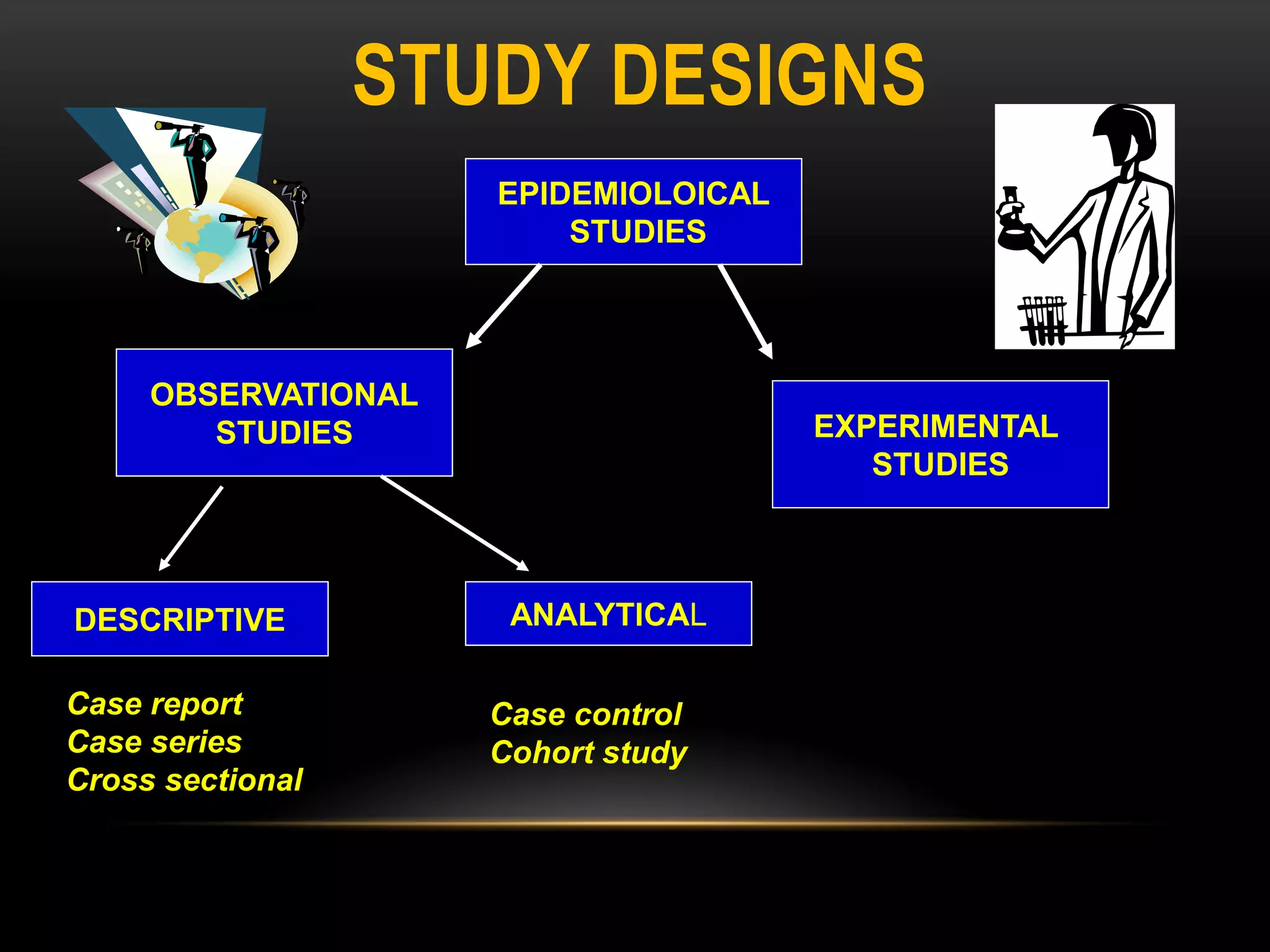 The document discusses experimental study designs and randomized clinical trials. It provides information on the different phases of clinical trials including objectives, demographics, and goals. Phase I trials test safety and dosing in small groups. Phase II explores biological effects and estimates response rates. Phase III confirms efficacy in larger and more diverse populations to provide evidence for marketing approval. Randomization, blinding, and placebos are used to reduce bias. Experimental studies directly manipulate variables under controlled conditions to measure outcomes compared to control groups.