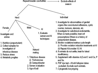 The document discusses repeat breeding in domestic animals, defining it as a condition in which cows or buffaloes exhibit normal estrus cycles but fail to conceive after multiple inseminations. It highlights various factors contributing to infertility, including nutrition, hormonal imbalances, and infections, as well as the diagnostic and therapeutic approaches to address these issues. Additionally, it emphasizes the complexity of diagnosing and treating repeat breeding in individual animals and recommends management strategies to improve reproductive outcomes.