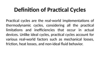 The document provides an overview of practical thermodynamic cycles, highlighting their real-world applications and implications, including the Otto, Diesel, Brayton, Rankine, and refrigeration cycles. It emphasizes the importance of considering practical limitations such as mechanical losses, heat losses, and incomplete combustion in cycle analysis to improve efficiency and design. Understanding these cycles aids in optimizing systems for performance, cost-effectiveness, and environmental sustainability.