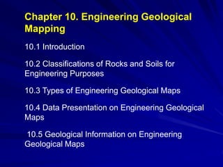 3) Classification of rocks and soils on maps is based on properties indicating physical/engineering characteristics, such as mineralogy, texture, structure, and weathering state.