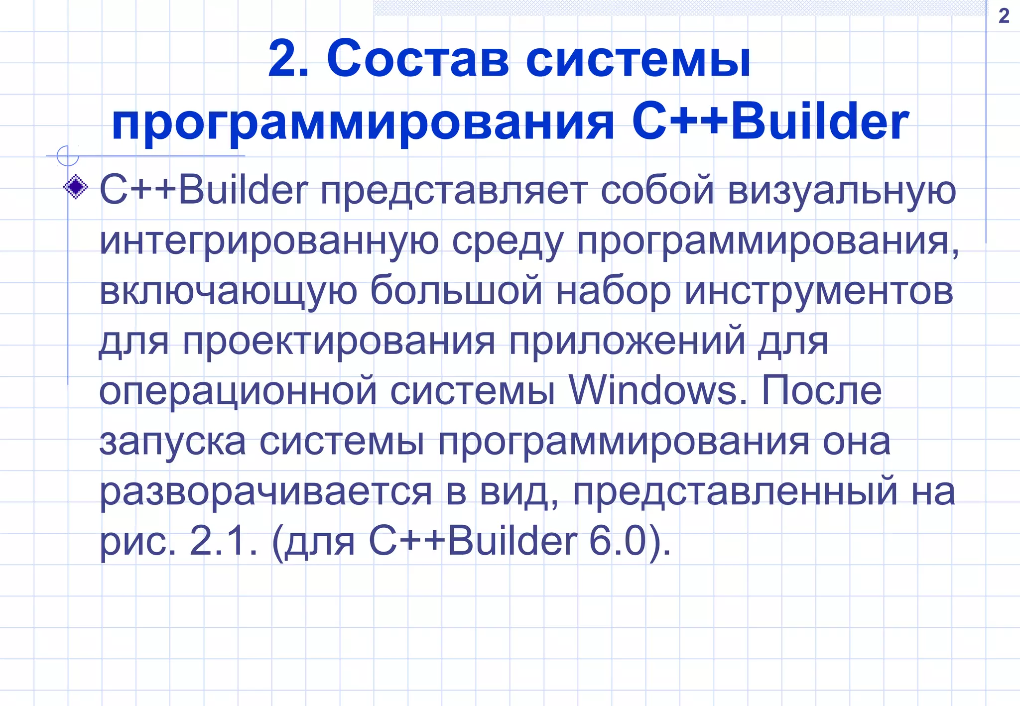 Документ описывает синтаксис и ключевые компоненты среды программирования C++Builder, включая интерфейс, панели инструментов, палитру компонентов, инспектор объектов, редакторы форм и кода, а также окно дерева объектов. Основное внимание уделяется функциональности этих инструментов, которые помогают программистам проектировать и управлять приложениями для операционной системы Windows. В заключение подчеркивается, что C++Builder предоставляет удобный инструментарий для разработки Windows-приложений благодаря своему визуальному и компонентному подходу.