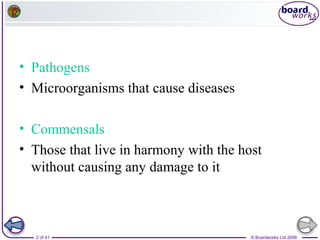 The document provides an overview of pathogens, how they cause diseases, and the body's immune response to infections. It explains the different types of pathogens, their modes of transmission, and the mechanisms of immunity, including active and passive immunity, as well as the role of vaccines. It also discusses the adaptive immune system's functions, such as the production of antibodies by B cells and the action of T cells against infected cells.