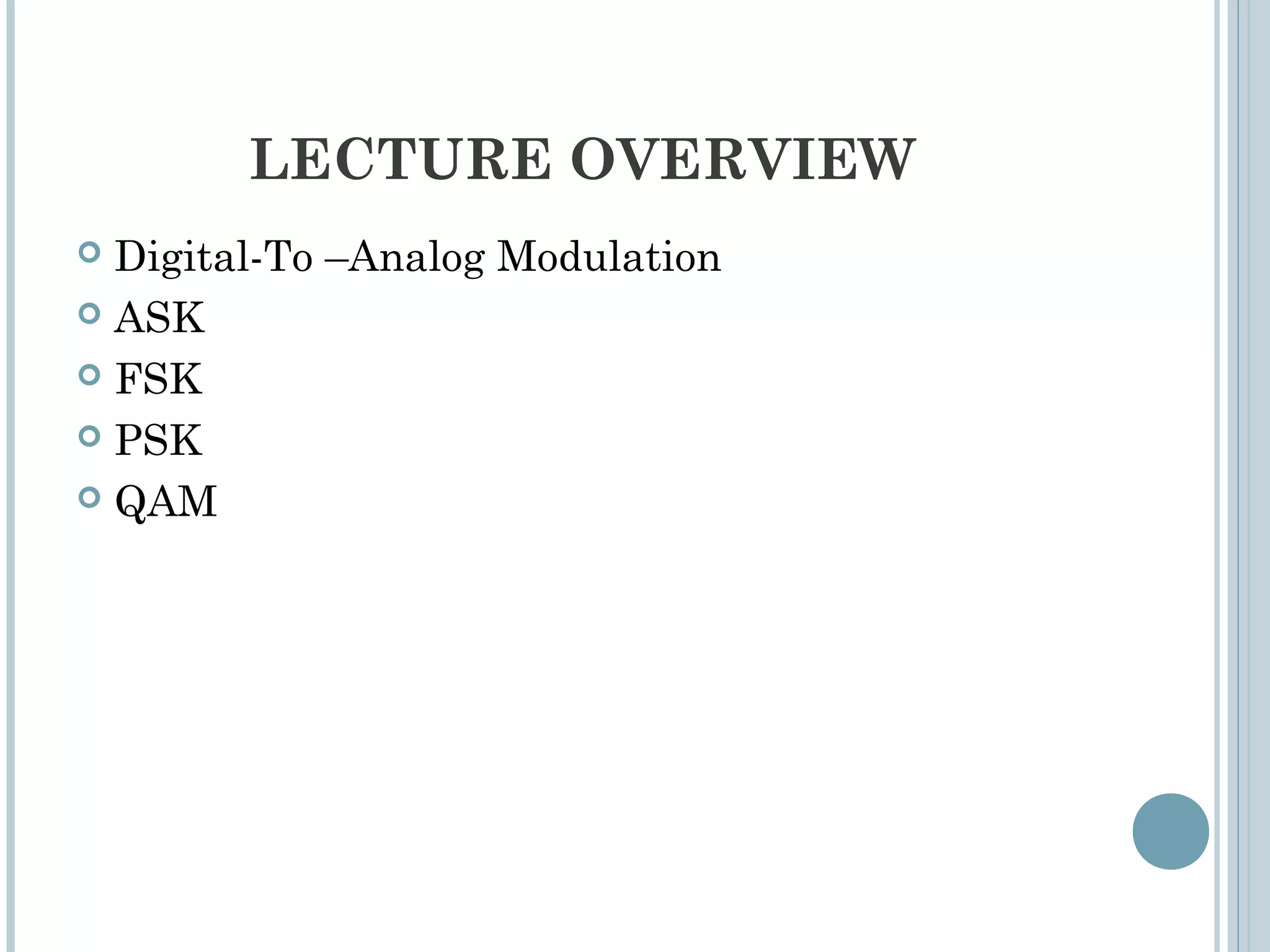 This document provides an overview of digital-to-analog modulation techniques used in data communications including: Amplitude Shift Keying (ASK), Frequency Shift Keying (FSK), Phase Shift Keying (PSK), and Quadrature Amplitude Modulation (QAM). It defines these techniques, discusses their advantages and limitations, and provides examples of calculating bit rates and bandwidth requirements. Key points covered include how digital data is modulated onto an analog carrier signal, the relationship between bit rate and baud rate, and how more advanced modulations like QAM combine aspects of ASK and PSK.