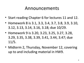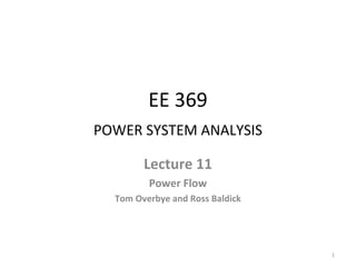 This document discusses a lecture on power flow analysis in a power systems engineering course. It provides announcements about homework assignments and an upcoming midterm exam. It also discusses examples of the Gauss two bus power flow method and the inclusion of PV generator buses in the Gauss-Seidel iteration method. Key concepts covered include slack buses, generator reactive power limits, and methods to accelerate Gauss-Seidel convergence.