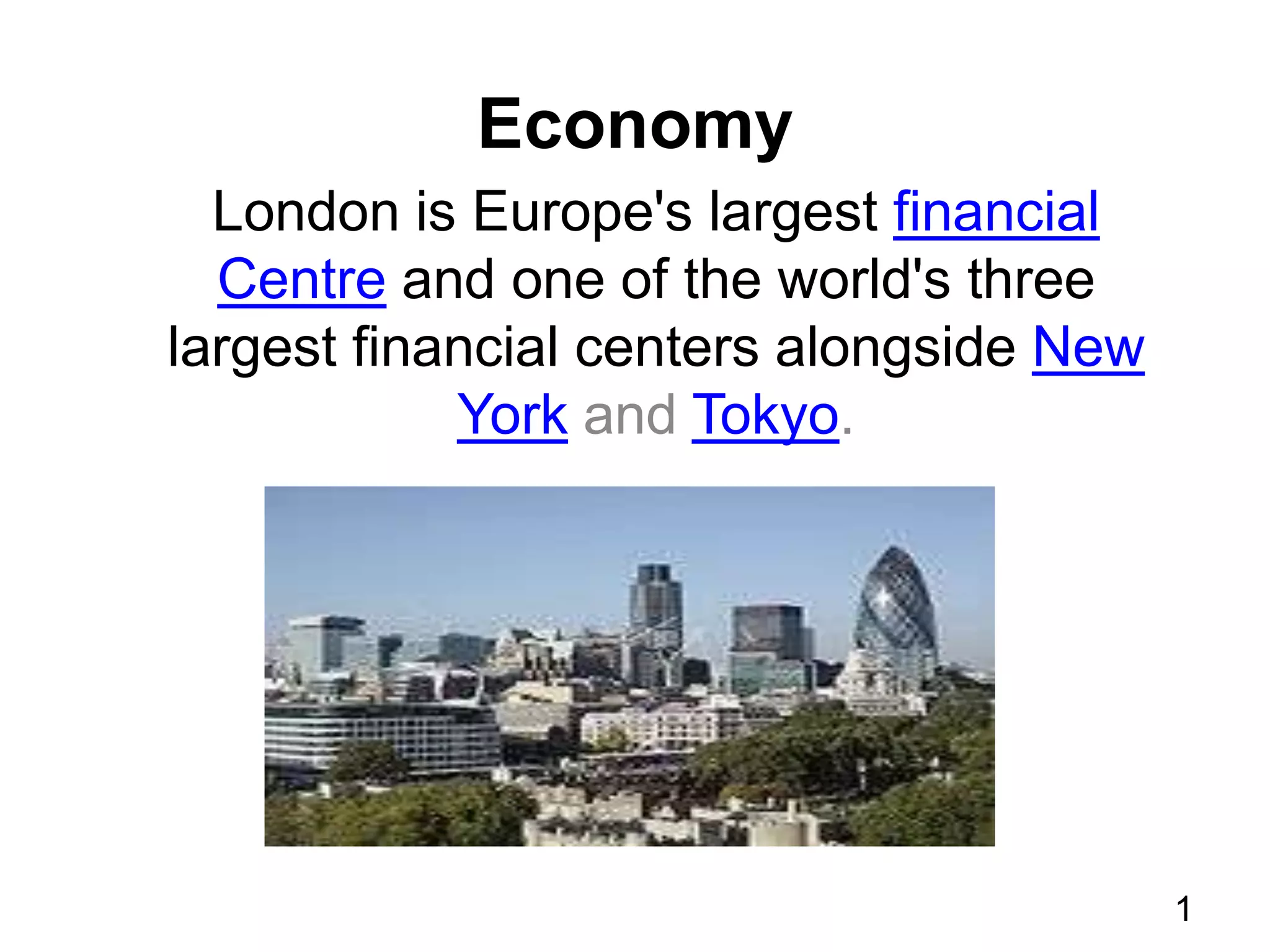 London is Europe's largest financial center and one of the world's top three alongside New York and Tokyo. The UK economy relies heavily on services, especially financial services centered in London, which accounts for about 73% of GDP. Manufacturing now makes up only about one-sixth of the economy compared to its previous importance during the Industrial Revolution, which began in the UK and drove its rise as a global economic and imperial power through the 19th century. The UK has transitioned to a primarily service-based economy led by sectors like banking, insurance and tourism, with London as a major global hub of business and commerce.