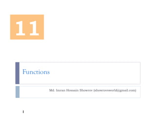 The document provides an overview of functions in C programming, detailing their definition, advantages, and how they can be defined and accessed. It explains the structure of a function, including its return type, name, parameters, and body, along with the concept of function prototypes and arguments. Additionally, it describes two methods for passing arguments to functions: call by value and call by reference.