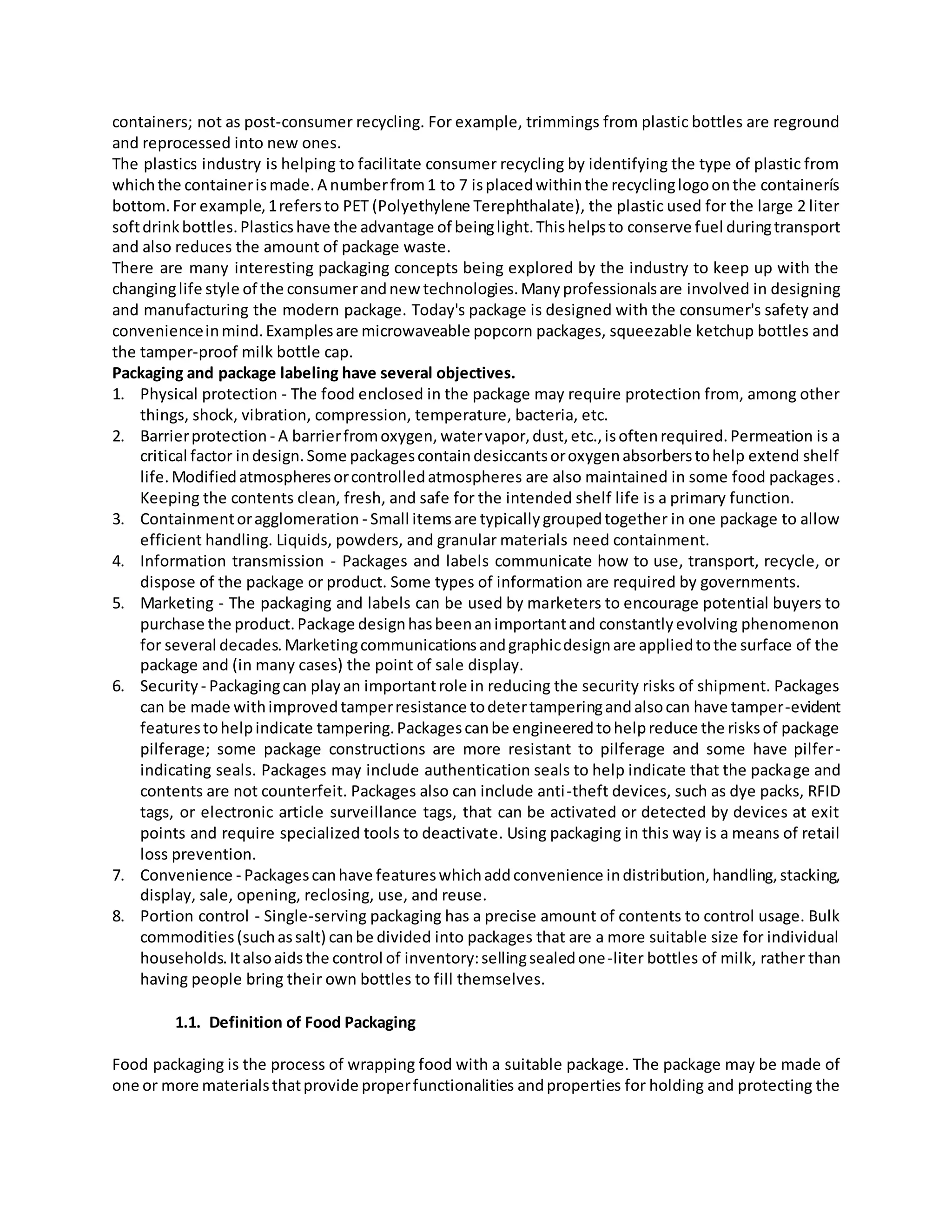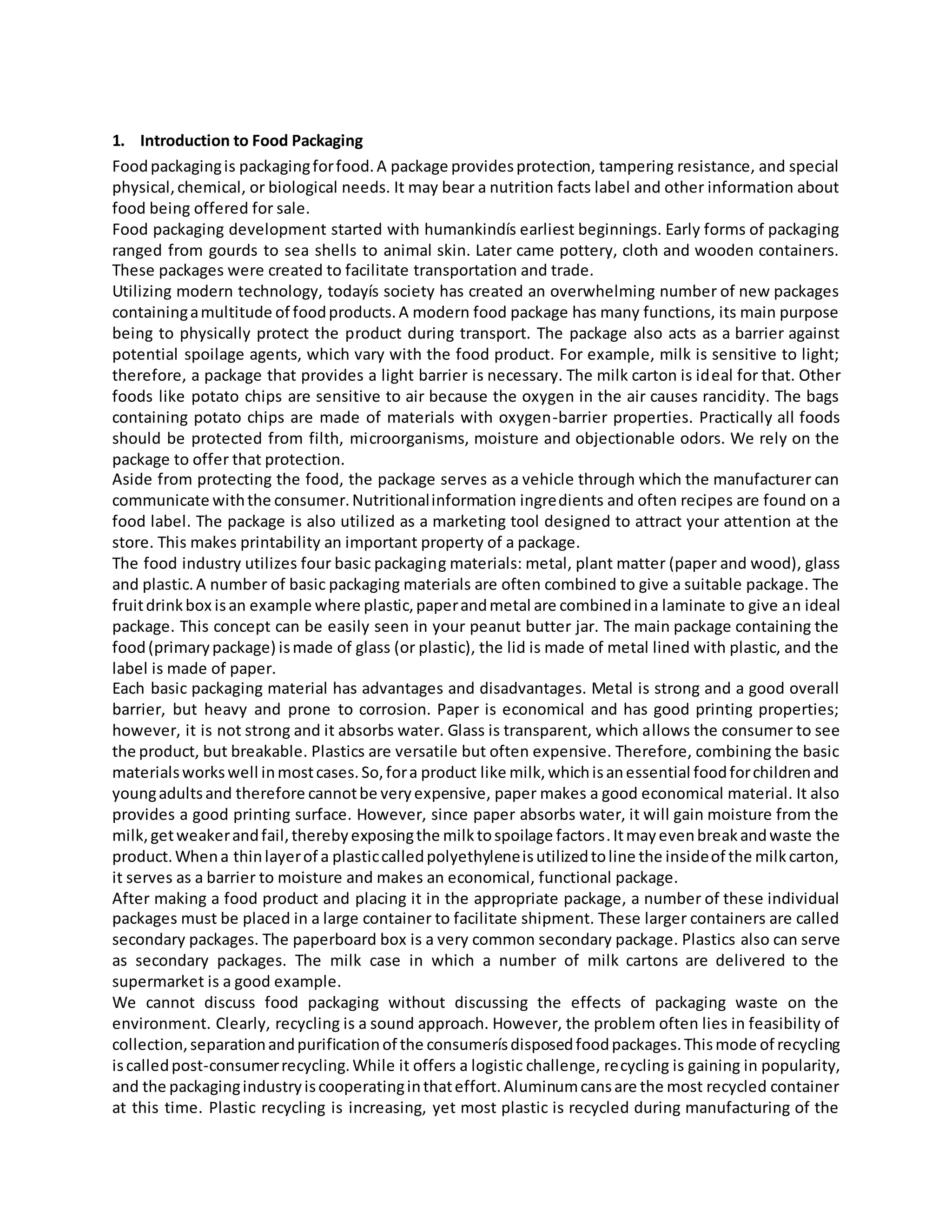 Food packaging serves several important roles - it protects foods from damage and contamination, contains foods, and provides consumers with important information. Packaging materials include metal, glass, paper, wood and various plastics, with each material having advantages and disadvantages. Modern food packaging must meet requirements for protection, marketing, traceability and more to safely deliver foods to consumers.