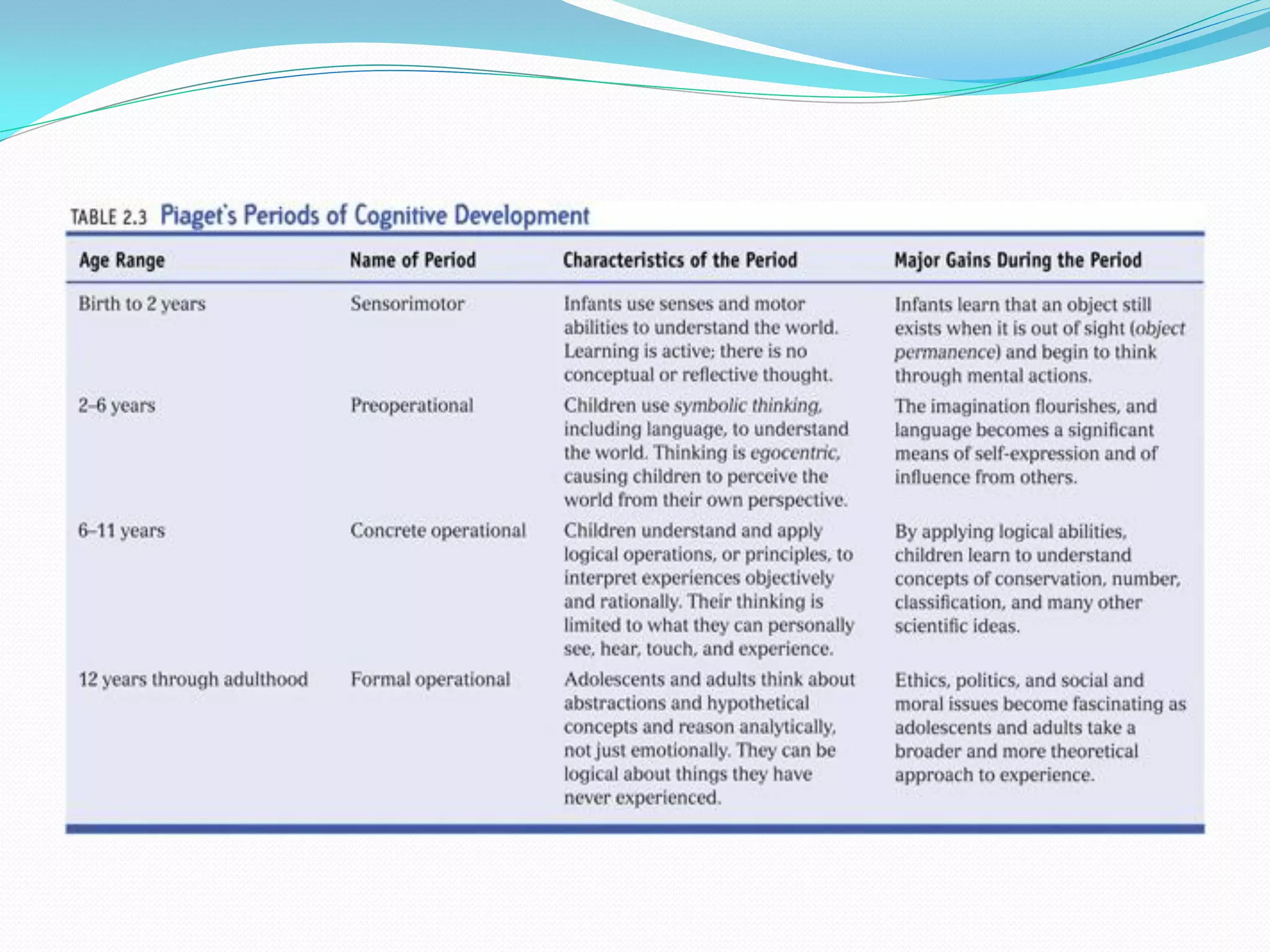 The document summarizes Jean Piaget's theory of cognitive development. It describes his four stages: sensorimotor, preoperational, concrete operational, and formal operational. For each stage, it provides examples of cognitive abilities and limitations. It also discusses criticisms of Piaget's theory and assessment tasks used to measure formal operational thought.