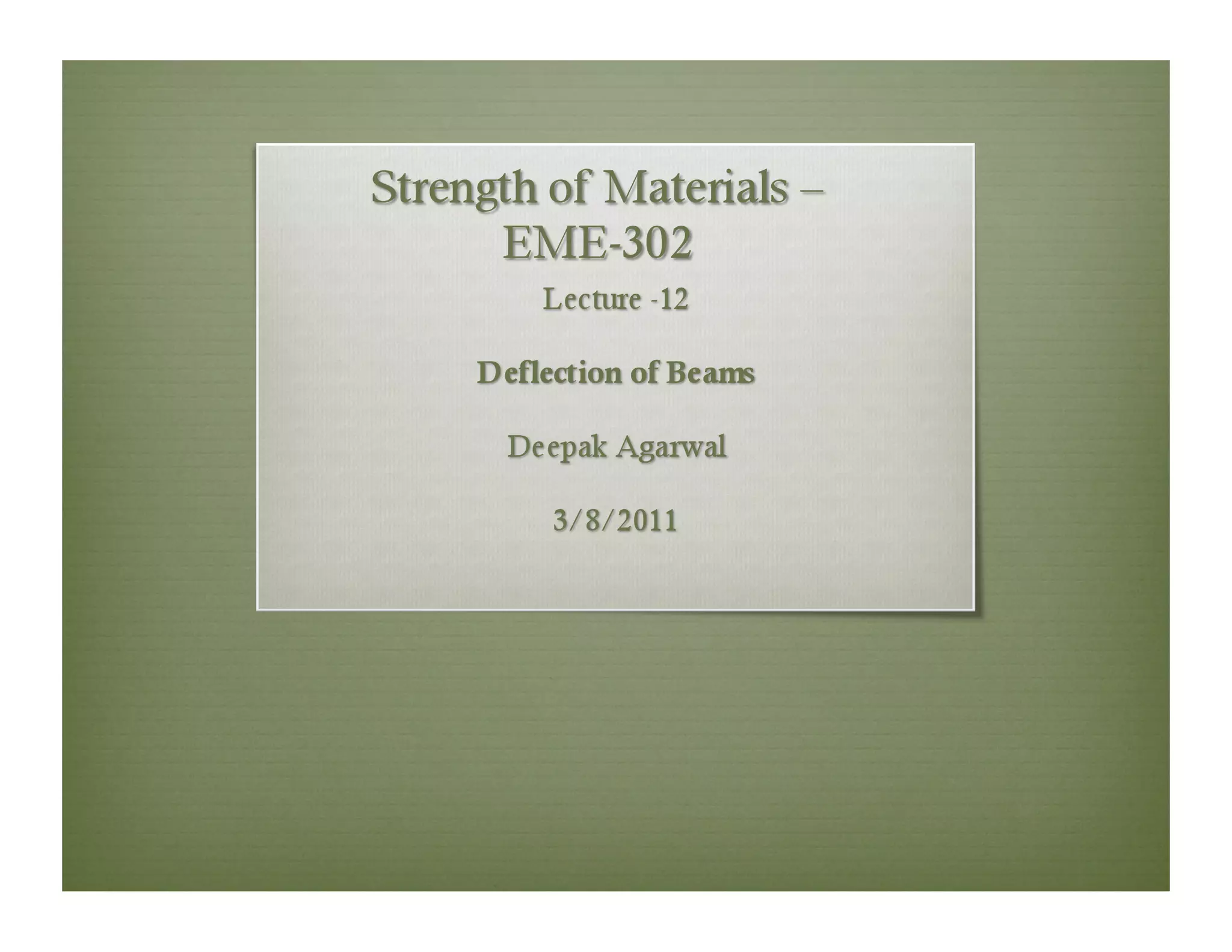 This document discusses stresses in beams and beam deflection. It covers several methods for analyzing bending stresses and deflection in beams, including: [1] the engineering beam theory relating moment, curvature, and stress; [2] double integration and moment area methods for calculating slope and deflection; and [3] Macaulay's method, which simplifies calculations for beams with eccentric loads. Formulas are provided relating bending moment, shear force, curvature, slope, and deflection. Moment-area theorems are also described for relating bending moment to slope and deflection.