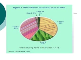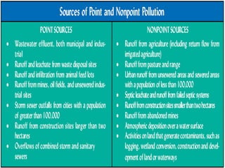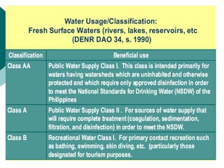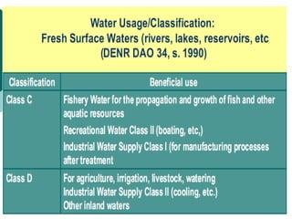 Water quality depends on various physical, chemical, and biological parameters. Key parameters for assessing water quality for human consumption include pH, dissolved oxygen, biochemical oxygen demand, temperature, conductivity, total dissolved solids, and turbidity. Monitoring these parameters provides information about water contamination levels and suitability for drinking and environmental uses.