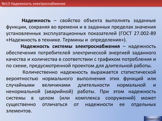 Документ освещает концепцию надежности электроснабжения, определяя ключевые показатели и категории электроприемников, включая их обязательные источники питания. Основное внимание уделяется статистическим величинам, показывающим вероятность безотказной работы, и мероприятиям, направленным на повышение надежности систем электроснабжения. Также описываются организационно-технические и технические меры, предназначенные для улучшения надежности, такие как применение новых материалов и методов организации обслуживания.