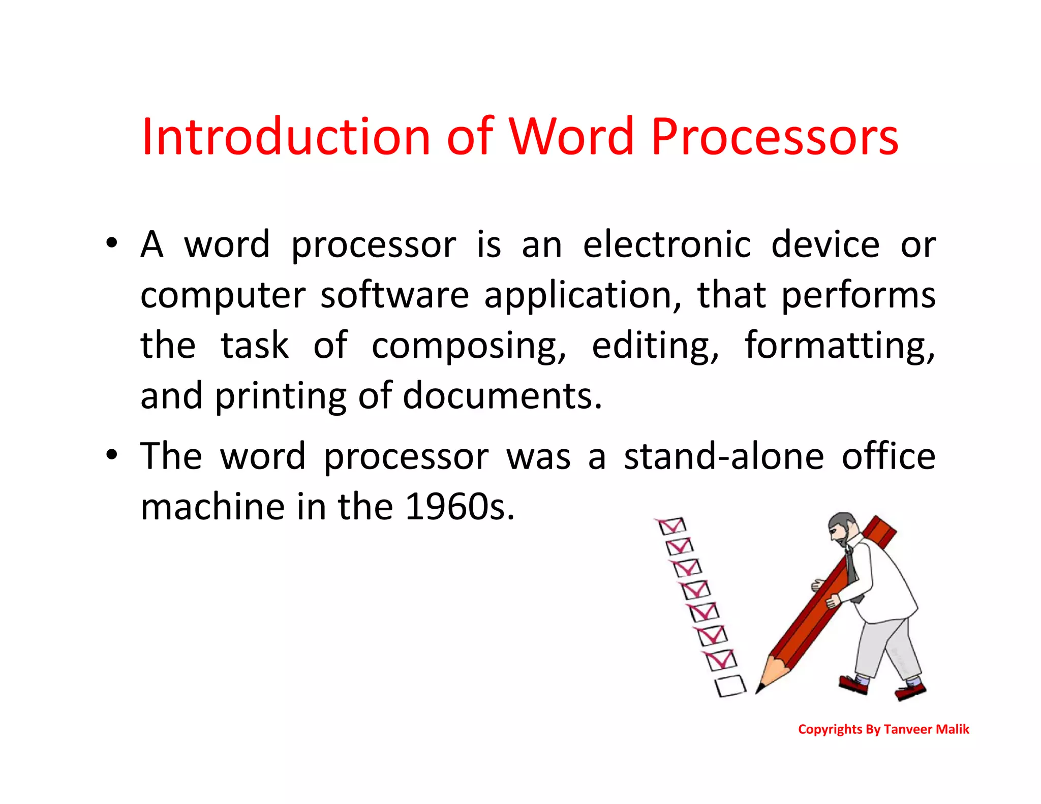 Word processors evolved from standalone machines in the 1960s that combined typing and printing functions, to software applications that became popular on personal computers. Early models had basic formatting options and saved to memory cards, while later versions introduced spell check and improved layout controls. Today, word processors like Microsoft Word are commonly used to create text files and allow formatting, editing, commenting and other advanced features. They automate tasks like formatting styles and indexing to help produce professional documents.
