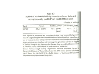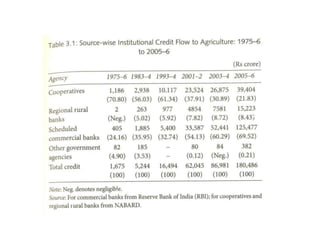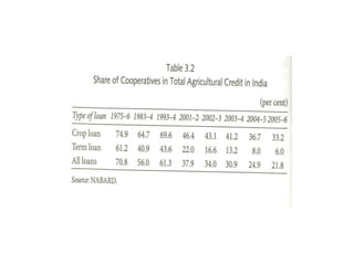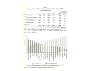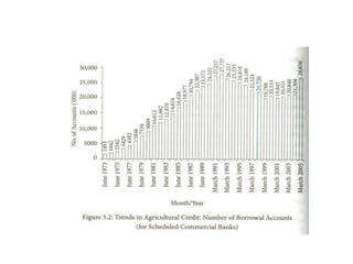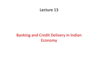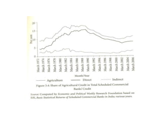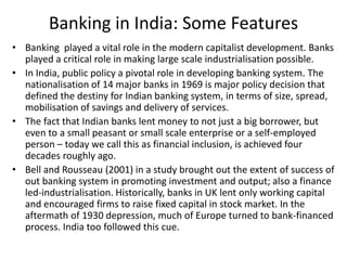 Banking played a vital role in India's development by financing large industries and promoting investment. Nationalization of banks in 1969 defined India's banking system by expanding reach and increasing savings mobilization and access. Studies show that rural branch expansion from 1970-1990 significantly reduced poverty and increased non-farm output. However, reforms in the 1990s led banks to prioritize large borrowers over small farmers and businesses, reducing credit to rural areas and priority sectors like agriculture.