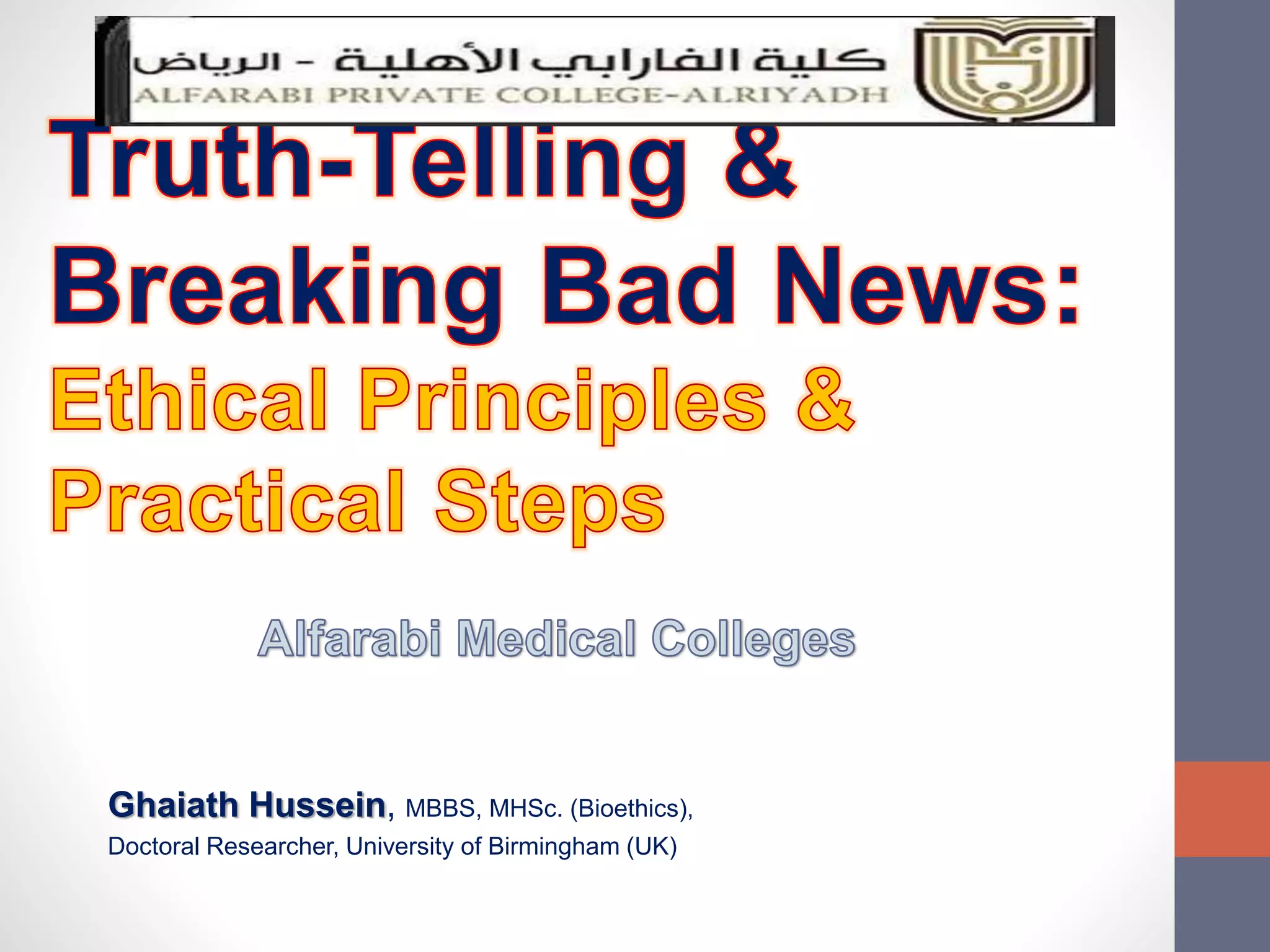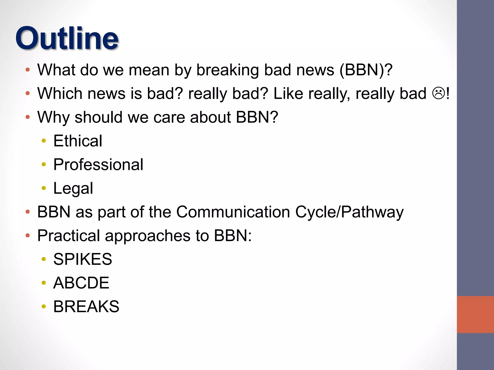 The document discusses the complexities and importance of breaking bad news (BBN) in a medical context, emphasizing ethical, legal, and professional responsibilities. It defines bad news, explores practical communication strategies such as the SPIKES and ABCDE frameworks, and highlights the emotional reactions patients may have, including the stages of grief. The document also addresses key considerations for effective communication, including preparation, empathy, and patient involvement.