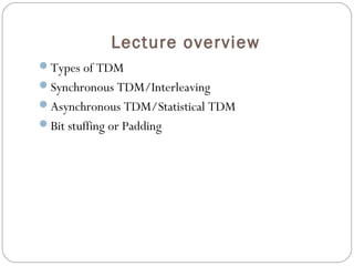 This document discusses synchronous and asynchronous time division multiplexing (TDM). It explains that synchronous TDM uses preassigned, fixed time slots that can result in wasted bandwidth. Asynchronous TDM allows dynamic allocation of time slots, reducing waste by filling frames only as needed. It also describes how telephone companies implement digital signal services like DS-1 and DS-3 through a hierarchy of T carrier lines like T-1 and T-3 that precisely match the data rates of the digital services.
