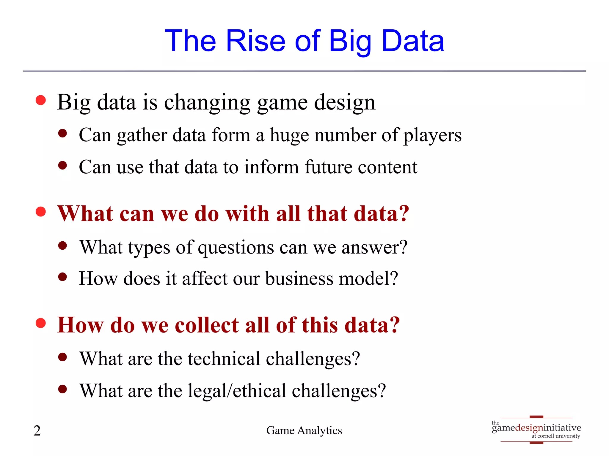 The document discusses game analytics and how game developers can use data from players to improve their games. It describes three categories of game analytics: player activity analytics, which examines individual player behavior over time; game system analytics, which analyzes the behavior of game economies and systems; and spatial data analytics, which considers the locations of player activity. The document provides examples of the types of insights and visualizations that can be gained from each category to help inform game design decisions.