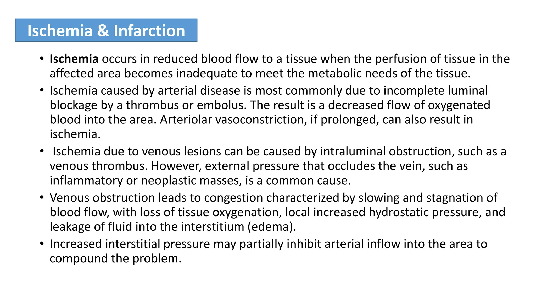 Ischemia occurs when blood flow to tissue is insufficient to meet metabolic needs, often due to arterial blockage or venous obstruction, leading to tissue damage. Infarction, a severe form of ischemia, results in coagulative necrosis and is influenced by factors such as vascular supply and tissue susceptibility to hypoxia. Infarcts are characterized as hemorrhagic or anemic based on blood accumulation, with varying appearances depending on the blood supply and nature of obstruction.