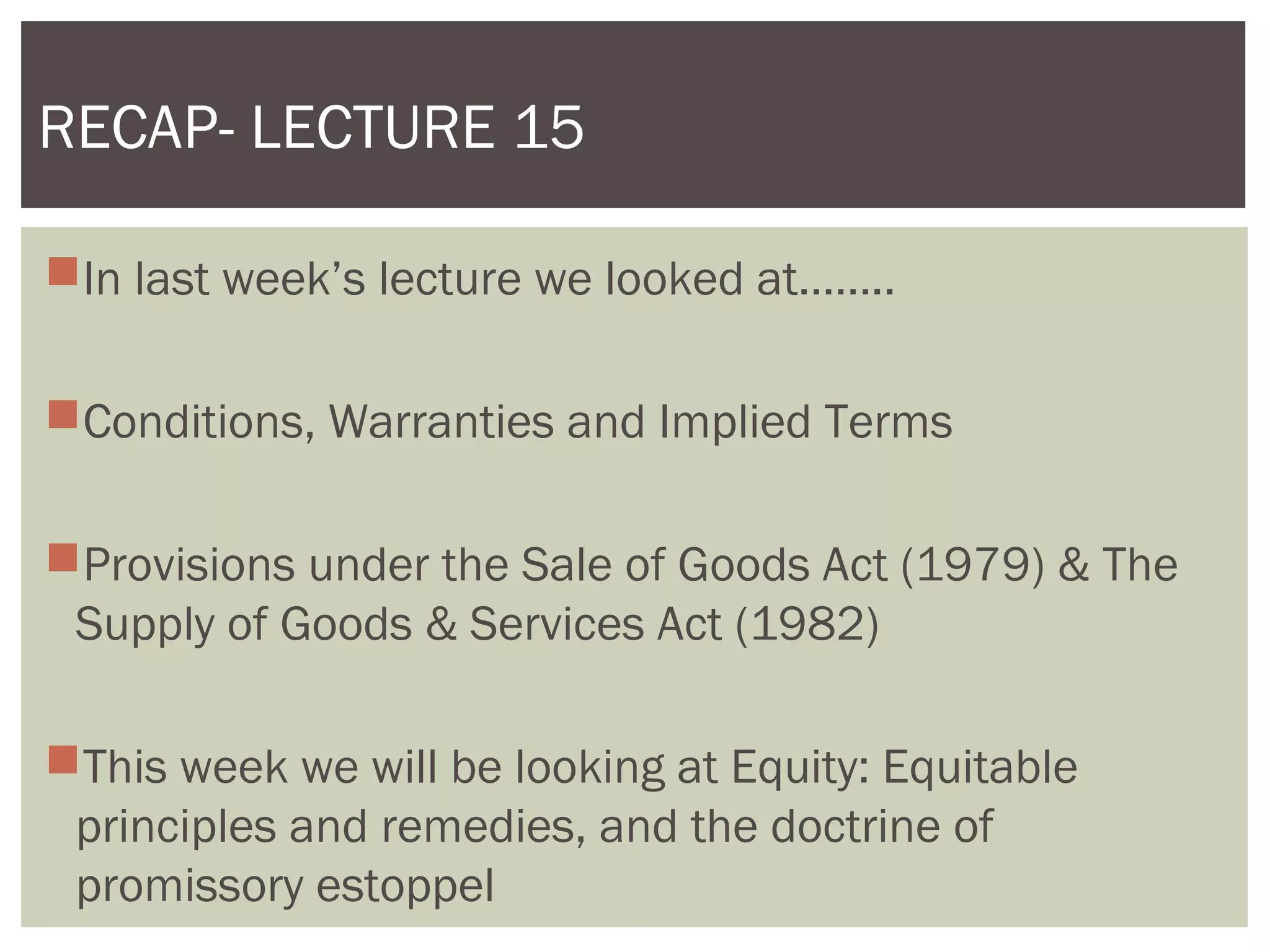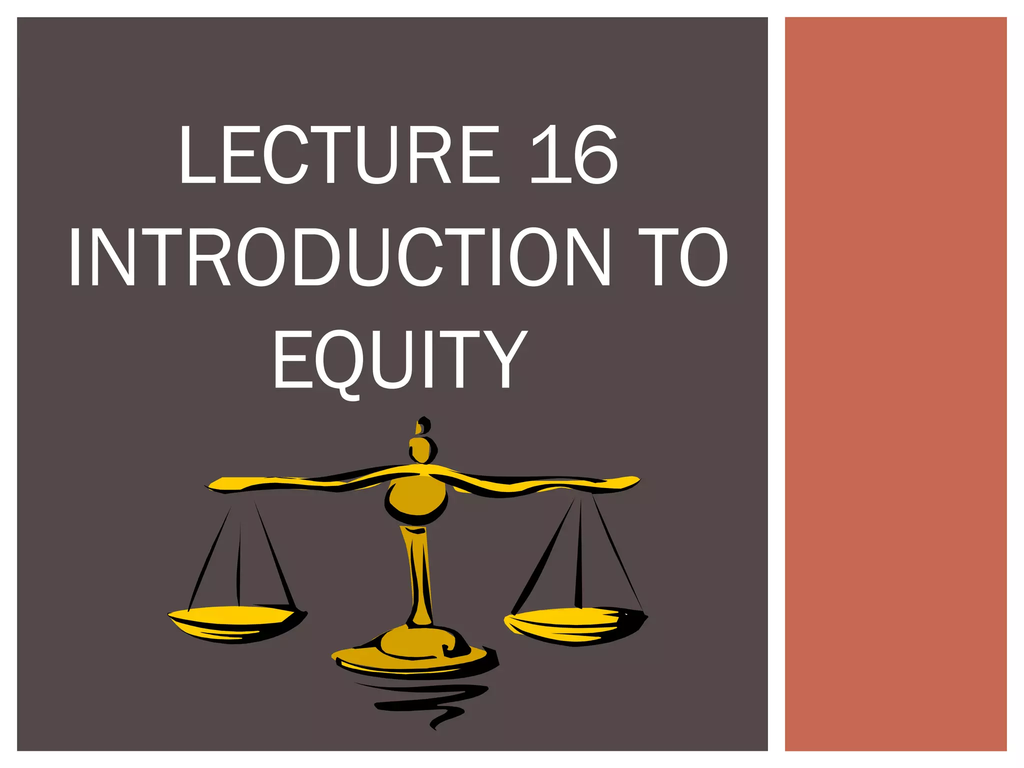 This document provides an overview of equity law and equitable remedies. It defines equity as fairness or natural justice that supplements common law rules. Historically, equity was administered separately in the Court of Chancery, but the Judicature Acts merged law and equity into a single court system. Equitable remedies include specific performance and promissory estoppel. The document discusses the Central London Property Trust v High Trees House case that established promissory estoppel and the "shield not sword" principle. Learning outcomes cover understanding equity, remedies, and applying principles from cases.