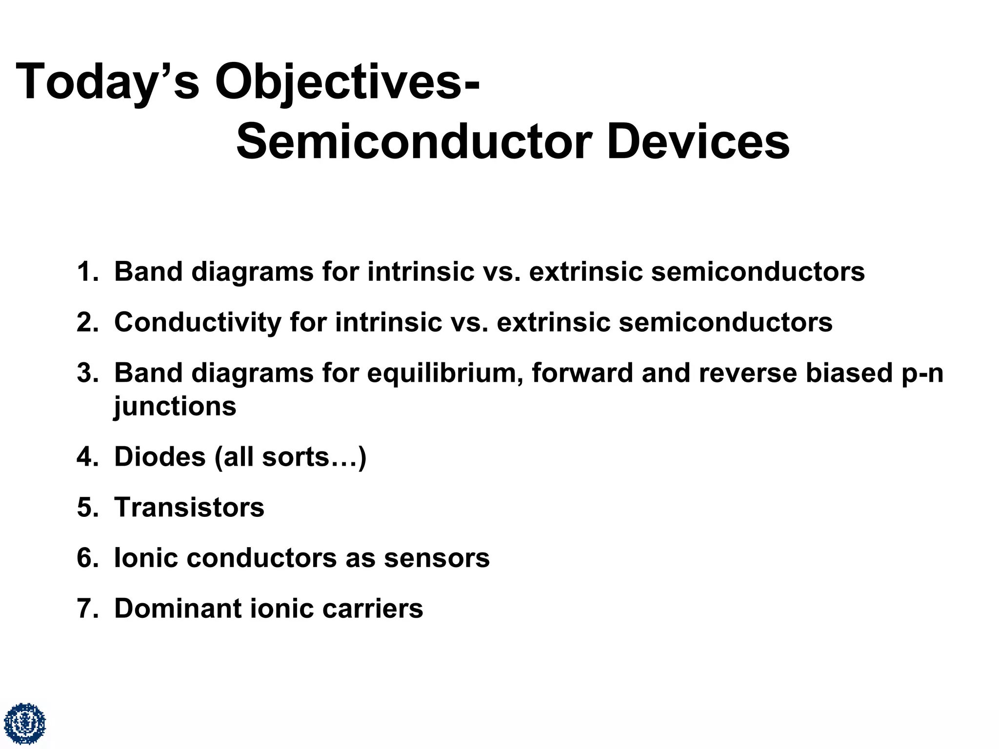 The document provides an overview of semiconductor devices, including band diagrams for intrinsic and extrinsic semiconductors, p-n junctions under equilibrium and bias conditions, and common semiconductor devices like diodes, transistors, photodiodes, LEDs, and their applications. Key topics covered include conductivity of intrinsic vs extrinsic materials, forward and reverse bias of p-n junctions, rectification properties of diodes, and basic operation of transistors.