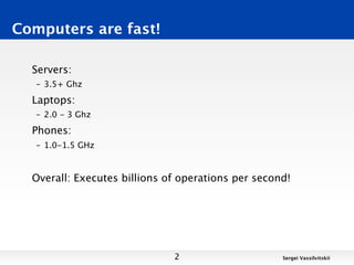 This document discusses techniques for finding the intersection between two large datasets efficiently. It begins by noting that while computers can perform billions of operations per second, datasets are huge, ranging from terabytes to petabytes in size. Two techniques for finding intersections are examined: scanning and sorting. Scanning has a runtime of O(n2) while sorting has a runtime of O(n log n), making sorting faster. Hashing is proposed as an even faster alternative with a runtime of O(n). Reasoning about algorithmic runtimes and how they scale with input size is discussed.