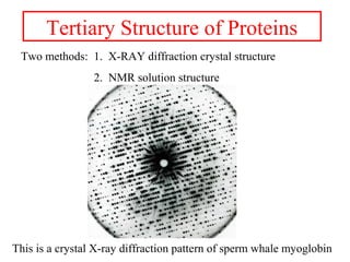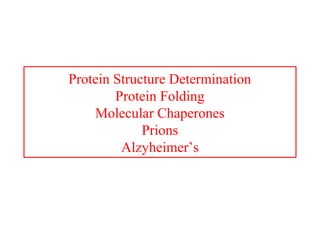 This document discusses various topics related to protein structure and folding. It provides details on methods for determining protein tertiary and quaternary structure using X-ray crystallography and NMR. It also discusses the protein folding problem, factors that influence folding, and diseases associated with misfolding. Molecular chaperones that assist with protein folding, such as GroEL, are described. Prions and amyloids, which form when proteins misfold, are also mentioned.