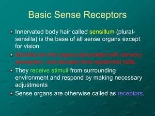 Insects possess five main senses: touch, hearing, smell, taste, and sight. Sensilla are hair-like sensory organs that detect stimuli from the environment and trigger responses. There are several types of sensilla that function as mechanoreceptors, auditory receptors, chemoreceptors, thermoreceptors, and photoreceptors. In particular, compound eyes composed of many ommatidia allow insects to detect light and vision, while antennae and tarsi contain chemoreceptors that detect smells and tastes. Johnston's organs and subgenual organs are examples of chordotonal organs that function as proprioceptors and detect sounds and vibrations.