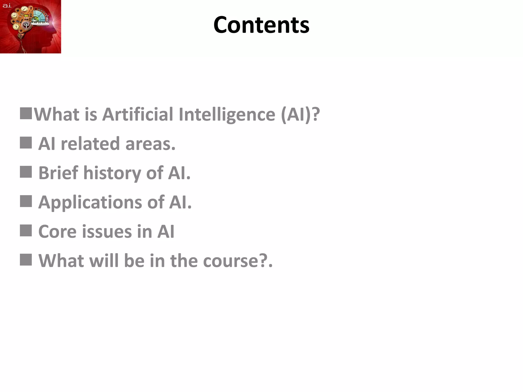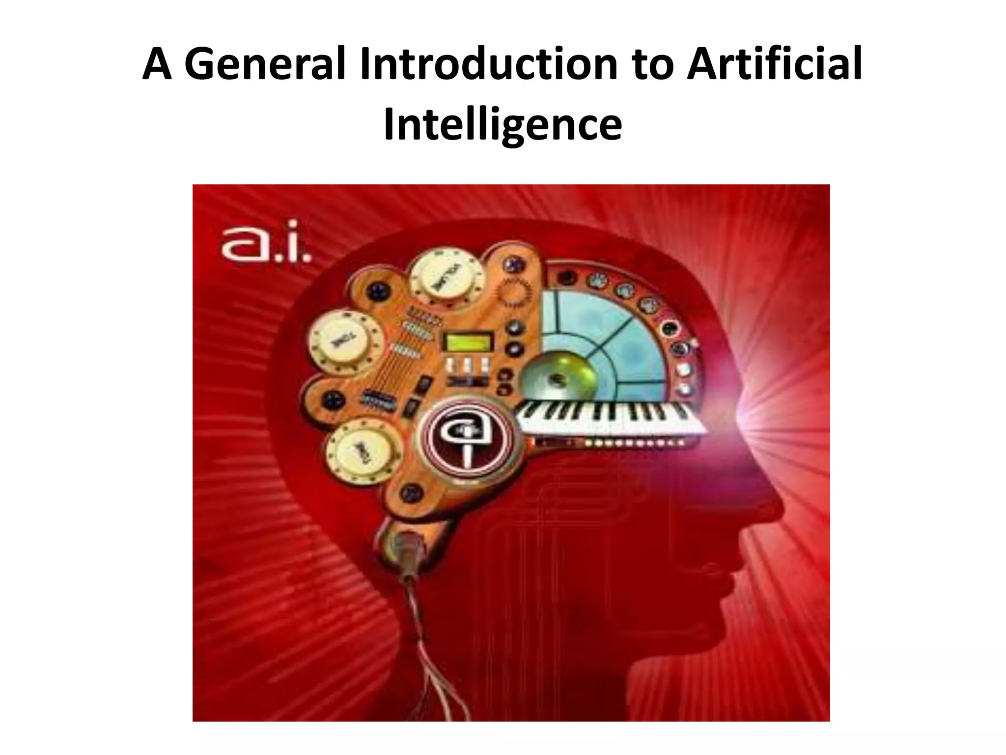 This document provides a general introduction to artificial intelligence (AI) including definitions of AI, different views on AI, a brief history of AI, core issues in AI, and applications of AI. It discusses what AI is, including strong AI which implies intelligent agents can become self-aware versus weak AI which implies agents can only simulate some human behaviors. It also summarizes different types of intelligent agents including simple reflex agents, model-based reflex agents, goal-based agents, and utility-based agents.