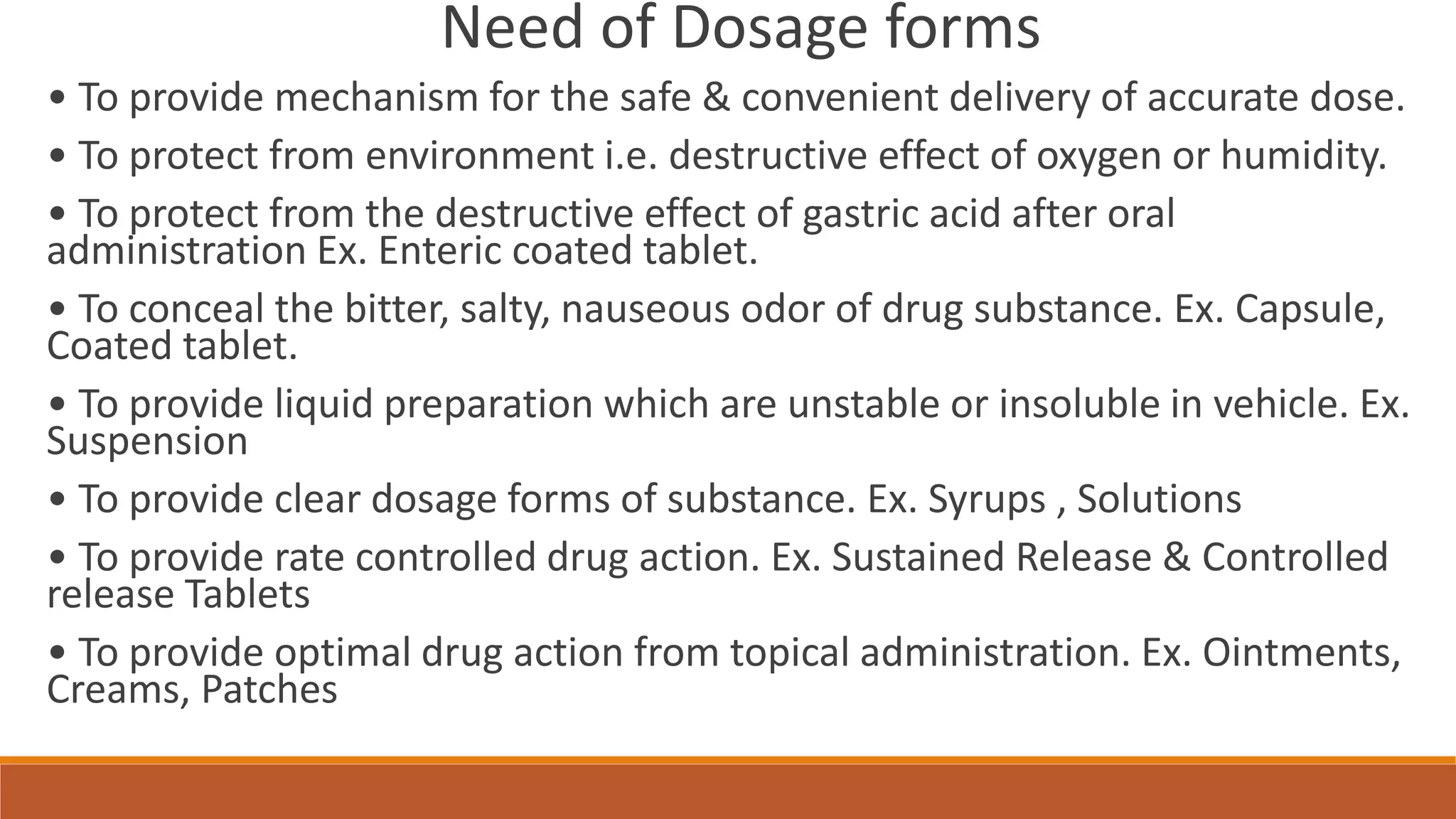 This document discusses the need for dosage forms and pre-formulation studies. It notes that dosage forms are needed to safely and conveniently deliver accurate drug doses while protecting drugs from environmental factors. Pre-formulation studies characterize the physical and chemical properties of drug substances to aid in the development of stable and effective dosage forms. These studies determine properties like solubility, stability, and compatibility with excipients. Understanding these properties provides insights to ensure quality during processing and storage.