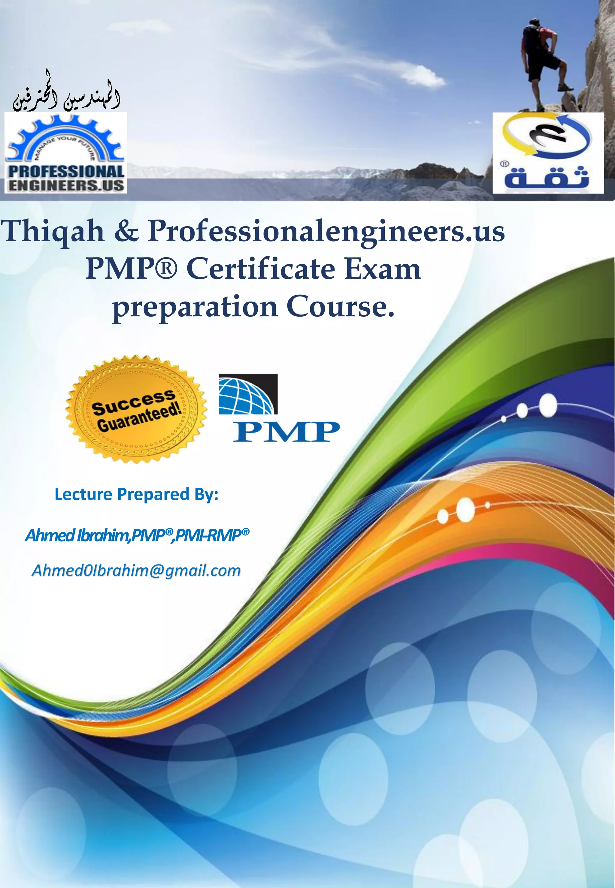 This document provides information about a Project Manager Professional (PMP) certification exam preparation course. The course is designed for project managers, engineers, construction managers, and others interested in project management. It will cover all nine knowledge areas from the Project Management Body of Knowledge, including project integration, scope, time, cost, quality, and risk management. The course is four weeks long with three-hour lectures three times per week, for a total of 35 hours. It aims to help students understand the concepts needed to pass the PMP exam on their first attempt.