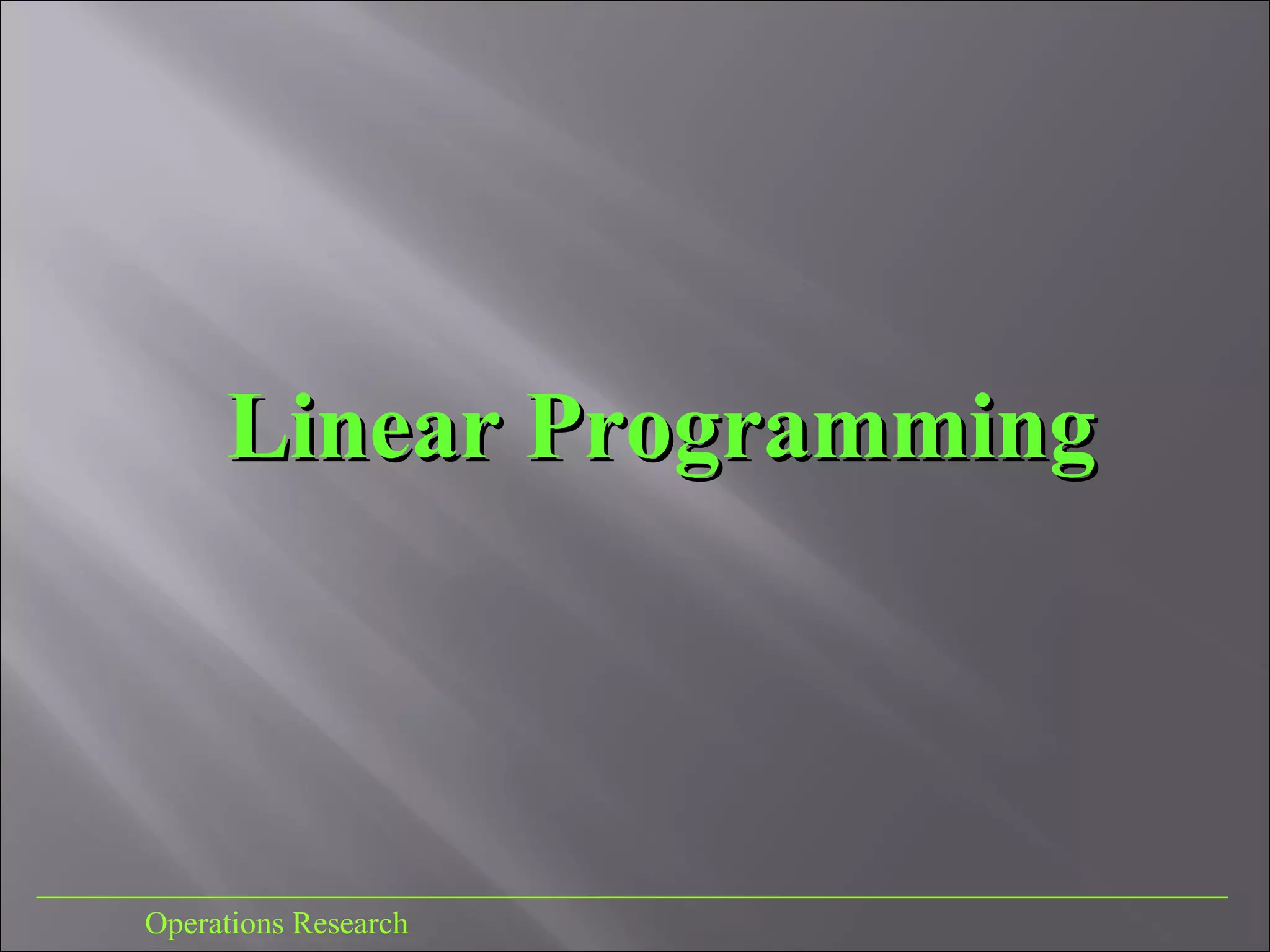 This document discusses linear programming, which is a technique in operations research for optimizing a linear objective function subject to linear constraints. It describes the modeling process, provides an example of maximizing profit from producing two products with limited resources, and discusses graphically representing and solving linear programming problems and interpreting their optimal solutions.