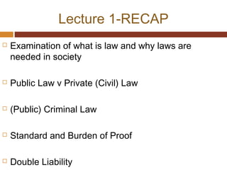 The document provides an overview of the English legal system, including the sources of law and the differences between common law and civil law systems. It discusses that the UK has a common law system, where laws come from three sources: statutory law from acts of parliament, common law from judicial precedent, and equity principles. It also explains key concepts like binding precedent from the ratio decidendi of higher court rulings, and that only superior courts can create precedent that lower courts must follow.