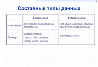 Документ обсуждает составные типы данных в прикладном программировании, включая массивы, динамическое размещение, и контейнеры, такие как векторы, списки и ассоциативные массивы. Объясняются основные операции над этими структурами данных, как их передавать в функции и как использовать стандартную библиотеку шаблонов (STL) для выполнения различных алгоритмов. Также рассматриваются итераторы и функции, применяемые для обработки элементов контейнеров.