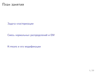 Лекция охватывает задачи кластеризации, включая смесь нормальных распределений и методы EM и k-means. Обсуждаются принципы и этапы кластеризации, такие как определение похожести объектов, оценка качества моделей и необходимость разметки данных. Также рассматриваются различные алгоритмы и модификации кластера, критерии качества и проблемы, возникающие из-за высокой размерности данных.