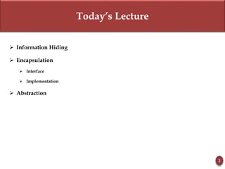 The document discusses key concepts of object-oriented programming including information hiding, encapsulation, interfaces, implementation, abstraction, and messages. It provides examples and definitions for each concept. Information hiding and encapsulation are achieved through making an object's state and behavior private and only accessible through its methods. An interface defines the methods an object exposes to others while implementation refers to the internal logic and data structures. Abstraction focuses on relevant properties and ignores irrelevant details, allowing for simplified models.