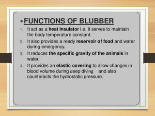 12. Blubber, a thick layer of fat or oil stored between the skin and muscles of the body, provides