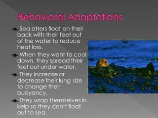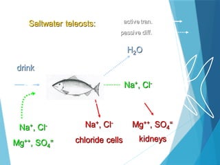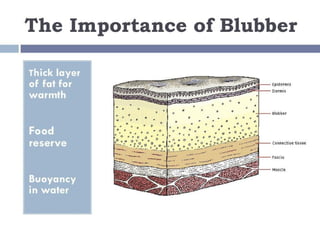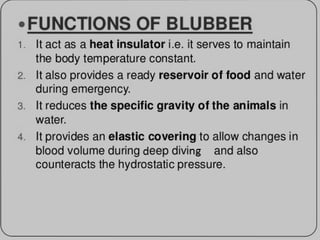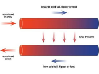 The document discusses various adaptations of aquatic organisms, focusing on how they evolve features to thrive in their respective habitats, particularly in freshwater and marine environments. It covers aspects of osmoregulation, thermoregulation, and specific adaptations such as streamlined bodies and specialized respiratory systems that allow marine mammals to survive in cold aquatic conditions. Additionally, it highlights the differences between freshwater and marine animals regarding osmotic strategies and adaptations to manage salinity levels.