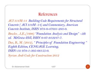 This lecture discusses the bearing capacity of foundations. It introduces Terzaghi's bearing capacity theory, which evaluates the ultimate bearing capacity of shallow foundations based on a failure surface geometry. Terzaghi's equation for ultimate bearing capacity is presented. Meyerhof's and Hansen's theories are also introduced, which improved on Terzaghi's theory. Hansen's theory provides a more general bearing capacity equation that can be applied to both shallow and deep foundations. Safety factors are applied to the ultimate bearing capacity to determine allowable bearing capacity for foundation design. Settlement criteria may also control and limit the allowable bearing capacity in some cases.