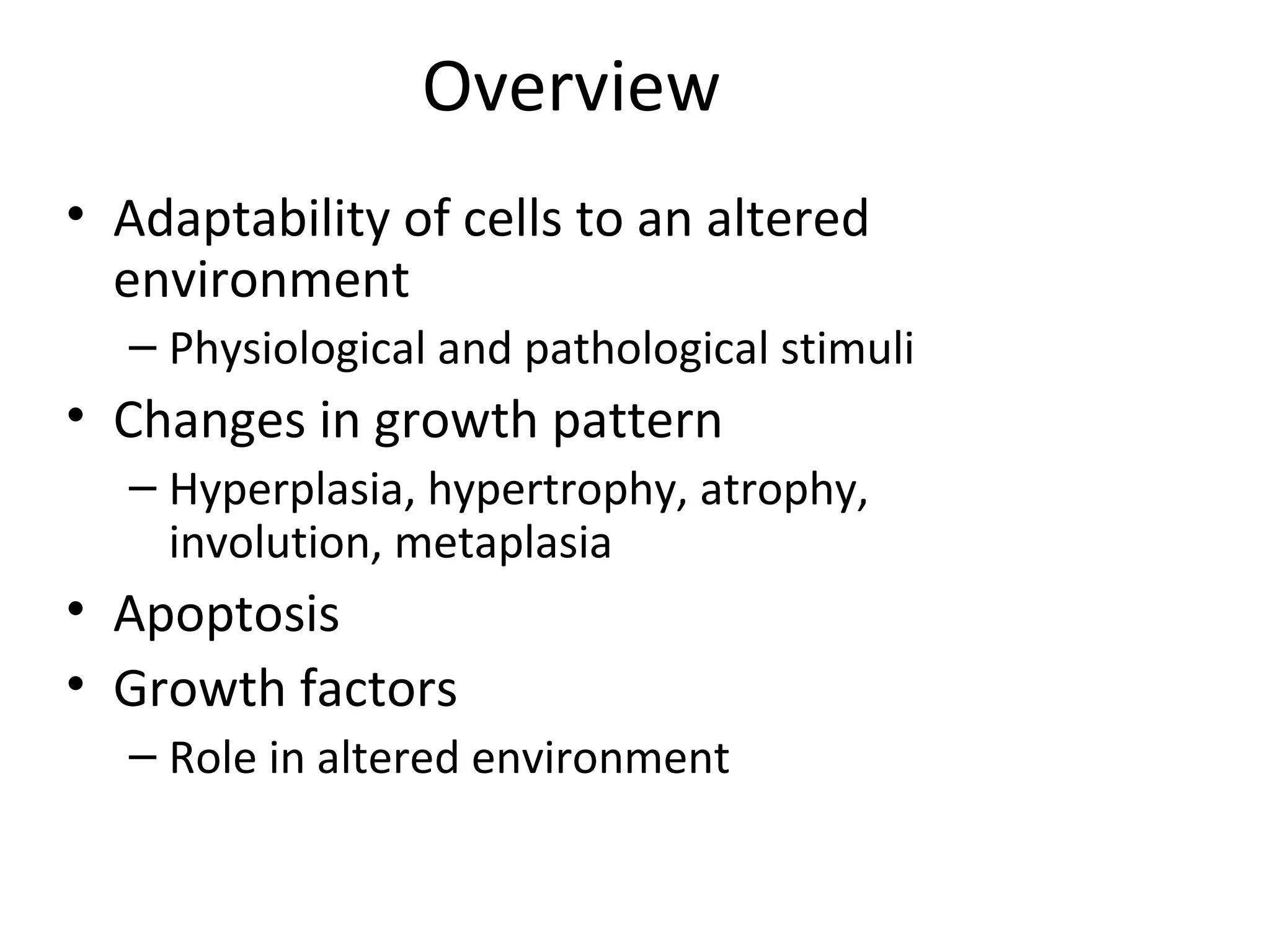 Cellular adaptations like hyperplasia, hypertrophy, atrophy, metaplasia, and apoptosis allow cells to respond to physiological and pathological stimuli in their environment. These adaptations preserve cell viability by allowing cells to modify their growth patterns or metabolism. Certain adaptations like sustained hyperplasia can increase cancer risk by providing fertile ground for neoplastic changes if the stimuli are persistent. Clinical terminology around cellular adaptations is important for understanding disease processes and responses.