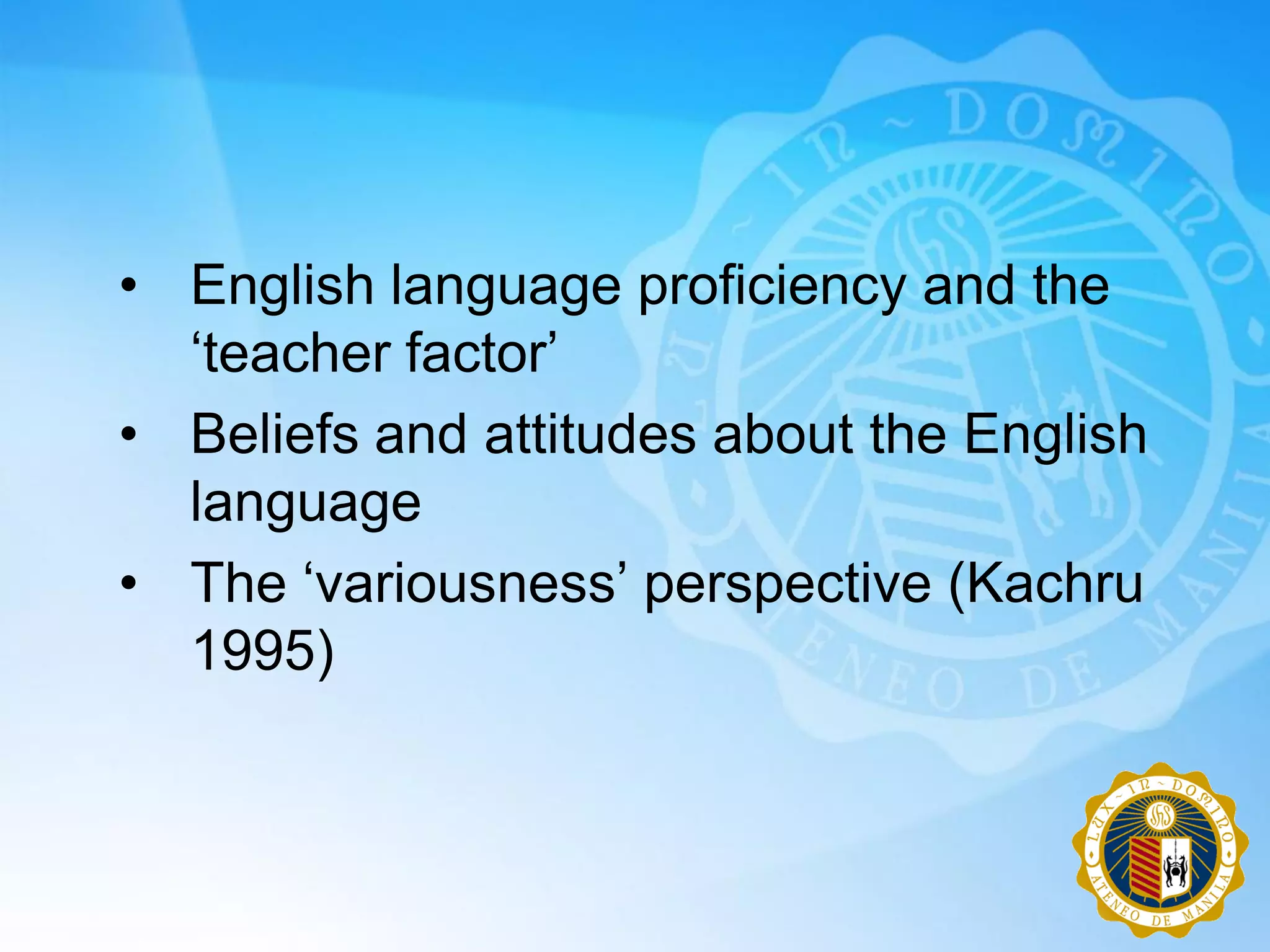 This document discusses the beliefs and attitudes that Philippine English teachers have about the English language. It finds that while teachers believe Philippine English is important because students are Filipino, the realities are more complex. Philippine English is changing and a variety with its own features. It also finds that viewing American English as the only standard creates a dependency myth. The document advocates for a "variousness perspective" that recognizes the diversity and fluidity of English, and approaches errors as opportunities for learning. This perspective may offer teachers a more realistic way to teach English in the Philippines' changing linguistic landscape.
