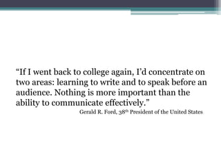 The document discusses the importance of communication skills, especially nonverbal communication. It notes that President Gerald Ford emphasized the importance of writing and public speaking abilities. It also outlines some key nonverbal communication skills like maintaining eye contact, facial expressions, posture, gestures, use of space and time, and personal appearance. The document encourages improving nonverbal skills through establishing eye contact, showing interest through posture, decoding nonverbal cues, being aware of how appearance and environment send messages, and getting feedback from others.