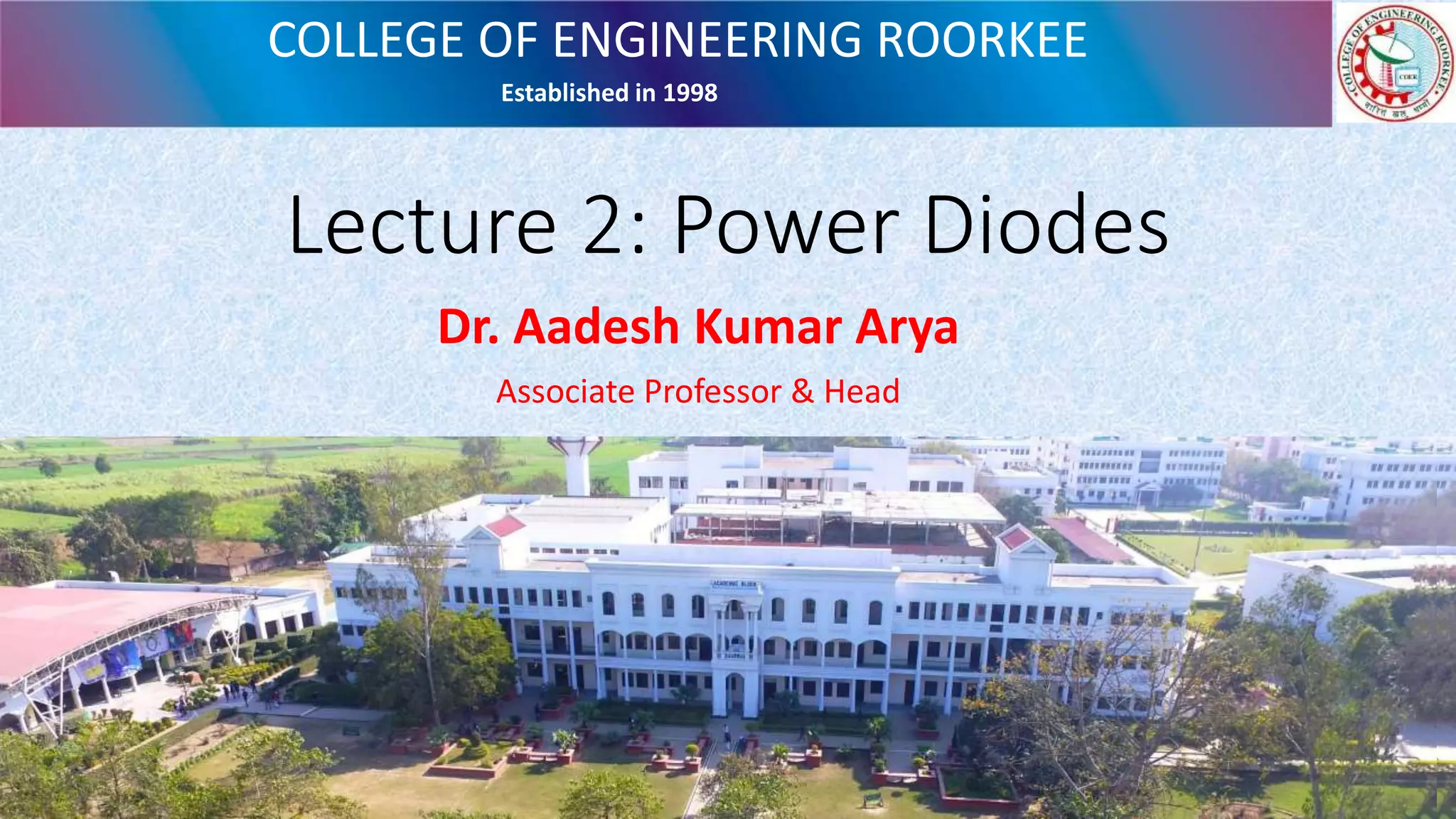 This document discusses power semiconductor devices used in power electronics applications. It describes the structure and operation of power diodes, including their P-I-N structure, forward and reverse characteristics, and turn-off behavior. Schottky diodes and their advantages over P-N junction diodes are also covered. The document then discusses power MOSFETs and their vertical channel structure for handling higher power. Finally, it briefly covers power bipolar junction transistors and compares them to other power devices like IGBTs and MOSFETs.