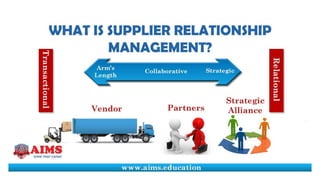 Procurement refers to the process of identifying, selecting, and acquiring suitable goods or services from third party vendors. It is an important part of a company's corporate strategy. The procurement process involves several steps - surveying the market, identifying suppliers, creating purchase orders, negotiating with suppliers, receiving goods, and developing contracts. Procurement is distinct from but related to purchasing, which refers more narrowly to acquiring goods and involves ordering, receiving, and payment. An effective procurement process manages risk and builds strong business relationships with key suppliers.