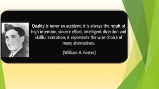 Quality assurance and quality control play important roles in the pharmaceutical industry to ensure product safety and efficacy. Quality assurance focuses on preventing defects through process improvement and monitoring, while quality control identifies defects through testing of raw materials, in-process materials and finished products. Both functions are necessary to consistently deliver high quality products that do not compromise consumer health. Key responsibilities of quality assurance include overseeing quality systems, monitoring validation activities and investigating issues like deviations. Quality control responsibilities involve testing, method validation, complaint investigation and stability studies. Together quality assurance and quality control form a quality culture from design through manufacturing and distribution.